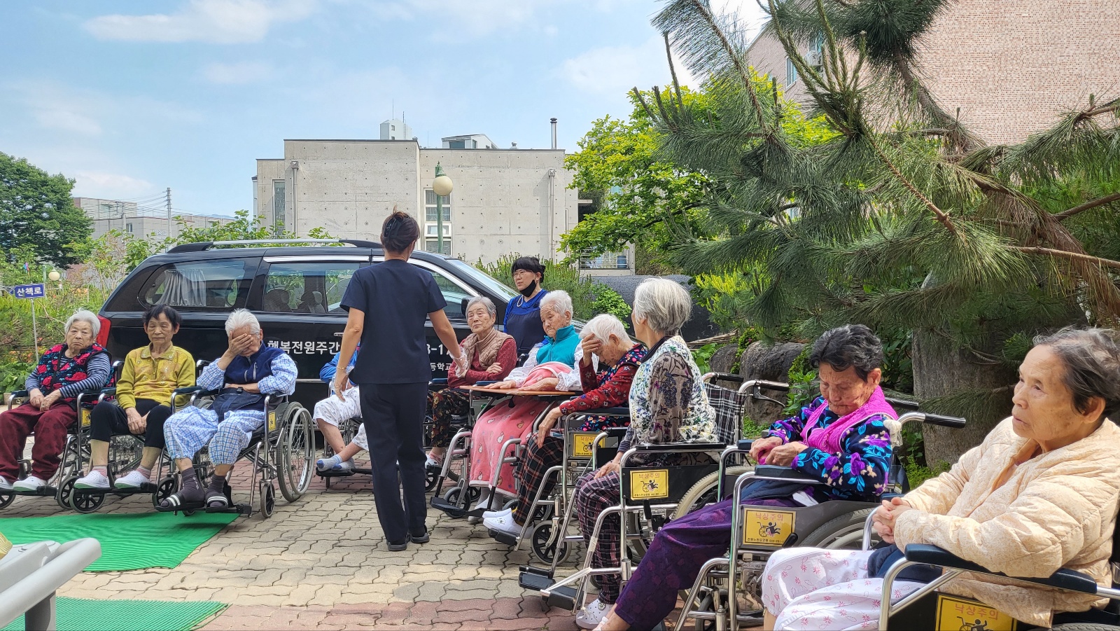 선생님들께서 어르신들 모시고 마당에 산책 나오셨네요^^